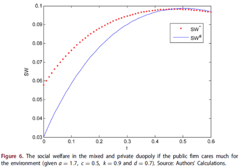 具体地,我们构建了混合寡头竞争模型,在模型中引入了衡量国有企业关注环境程度的参数(k),推导出了模型的均衡结果。通过对均衡结果进行分析,得到了在不同的环境税率和环境关注程度下,国有企业民营化对企业环境研发(Figures 1 and 2),环境损害(Figures 3 and 4)和社会福利(Figures 5 and 6)等产生的影响。