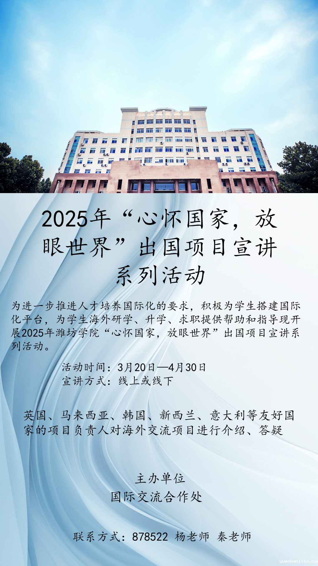 本系列活动将以线上或线下的方式举行,届时将邀请来自英国、马来西亚、韩国、新西兰、意大利等国友好院校的项目负责人对海外交流项目进行介绍、答疑。其中,英国北安普顿大学专场说明会定于3月20日(周四)19:00在7422教室举行,其余国家院校的宣讲日期将后续通过国际交流合作处官网(https://fao.wfu.edu.cn)发布通告,敬请关注。