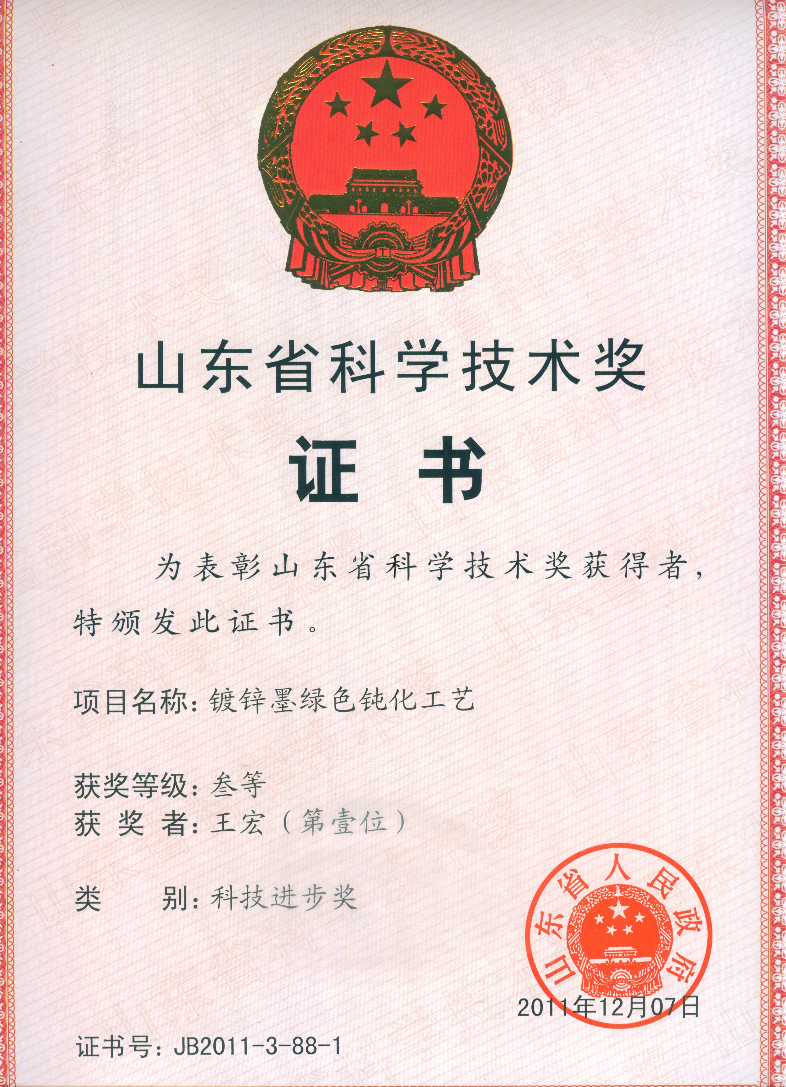 该成果2011年12月获山东省科技进步三等奖。该成果已在莱州华银电镀有限公司、烟台日晟汽车制动系统有限公司等单位得到成功应用,经用户使用证明,该成果工艺稳定性好、可操作性强、设备投入不大,对企业的生产改型及新上项目均很适合,经济社会效益显著。