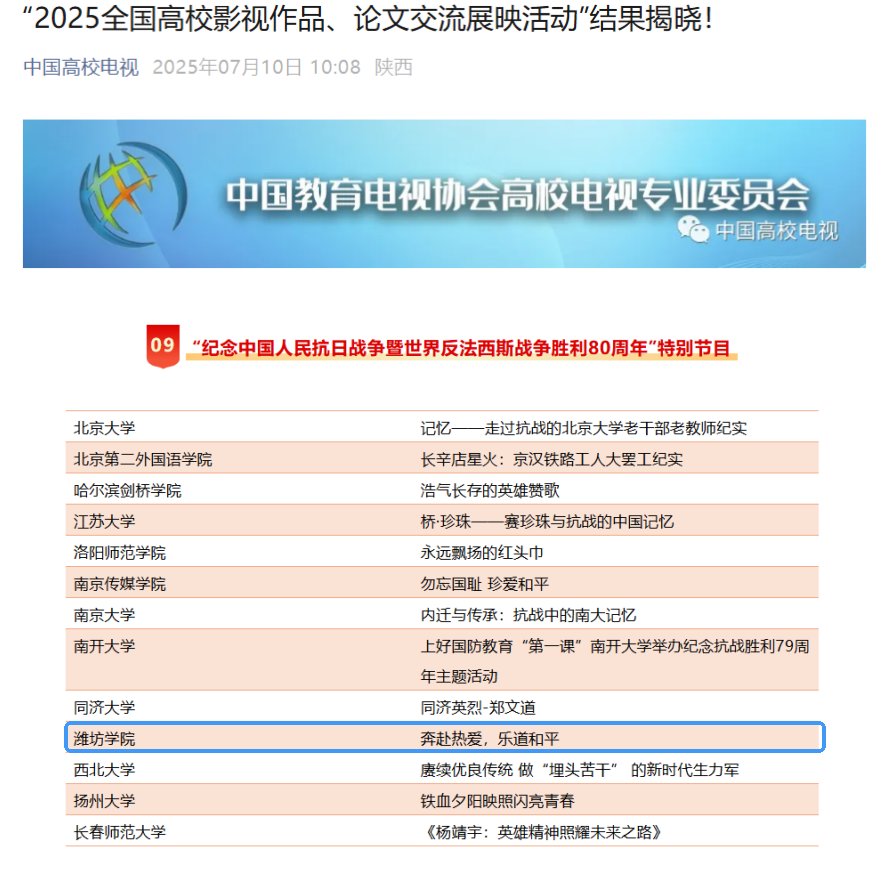 本次展映活动于2025年5月启动,共收到来自全国101所高校报送的1256部影视作品,涵盖新闻、纪录片、短视频、AI创作等多个类别。为弘扬伟大抗战精神,传承红色基因,活动特别设立“纪念中国人民抗日战争暨世界反法西斯战争胜利80周年”主题作品单元。经过北京大学、清华大学、西安交通大学、电子科技大学、浙江传媒学院等高校专家组成的评审团队两轮严格推选,最终全国共有13所高校的作品获评该主题“特别节目”荣誉,《奔赴热爱,乐道和平》成功入选。