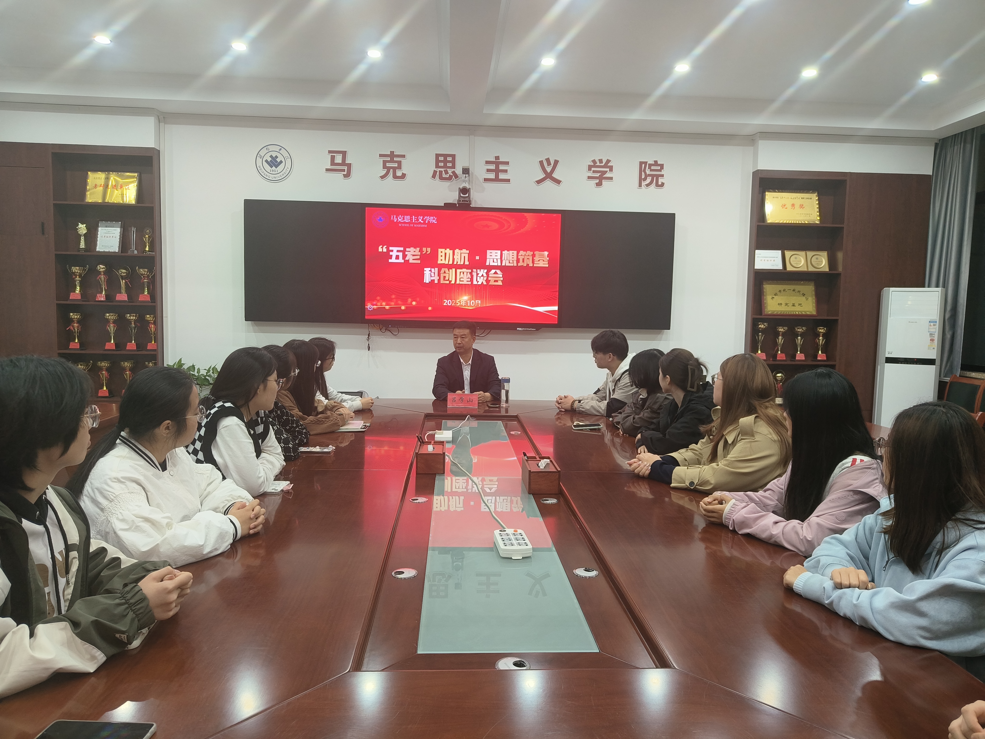 座谈会上,吕学山指出“五老”是党和国家的宝贵财富,是引导青年学生树立正确科创观、价值观的重要力量。他就“思政专业如何融入科创比赛”分享思路与经验,勉励学生要敢于想象、善于探索、勇于突破,扎实打好专业基础,厚植创新意识。