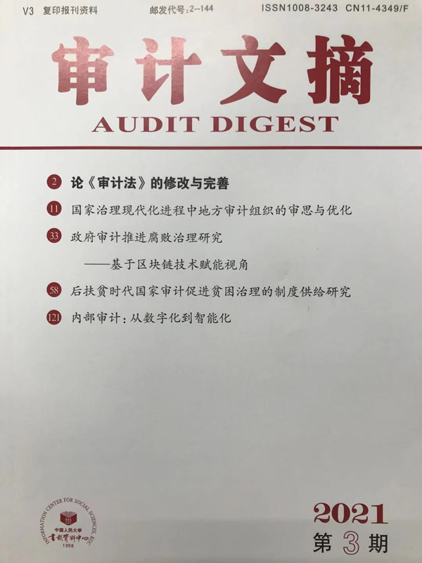 近日,我校经济管理学院青年博士王波副教授的论文《后扶贫时代国家审计促进贫困治理的制度供给研究》分别被人大复印资料《审计文摘》2021年第3期、《财务与会计导刊(理论版)》2021年第4期全文转载,并成为当期的封面文章,受到了学术界的广泛关注。