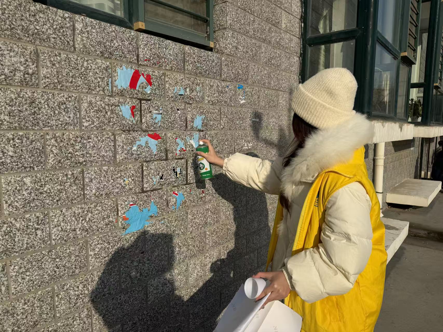 寒风之中,队员们默契协作:有人负责喷水软化,有人专注铲刮剥离,有人则擦拭墙面收尾。分工明确、配合无间的身影,构成了社区里一道亮眼的风景线,引得路过居民驻足赞许。