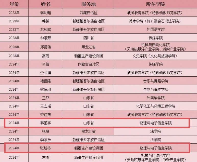 近日,全国大学生志愿服务西部计划项目管理办公室发布《关于印发2024—2025年度大学生志愿服务西部计划考核等次优秀志愿者名单的通知》,物电学院韩星宇、张培栋两名志愿者凭借突出的服务表现,成功入选名单,荣获“2024—2025年度大学生志愿服务西部计划考核等次优秀志愿者”称号。
