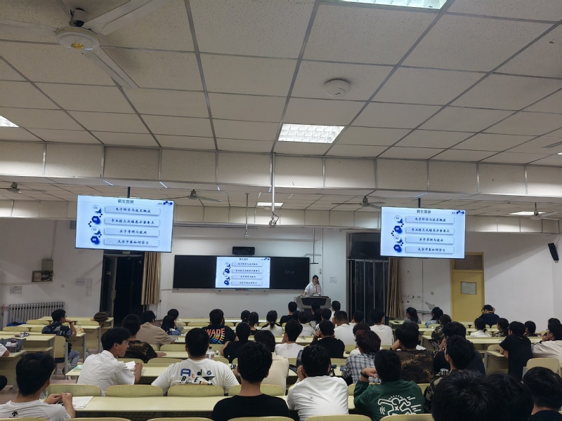 电子科学与技术系主任高娟娟担任主讲。她从专业概述、培养方案要点、考研与就业规划及大学学习方法四大模块展开讲解,系统阐述了专业理工融合的特点、核心课程体系,明确了考研备考重点与就业能力培养方向,为新生学业发展提供了全面指导。