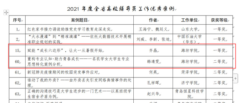 近日,山东省教育厅公示了2021年度“辅导员工作优秀案例”评选结果,我校报送的案例《赋能“成长六边形”,让大一从暑假开始》工作案例荣获一等奖;《重构专业认知助力青春成长——一名农学女大学生专业思想转化案例分析》工作案例荣获二等奖。